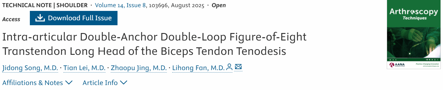 双锚双环八字形肱二头肌长头腱固定术(Intra-articular Double-Anchor Double-Loop Figure-of-EightTranstendonLong Head of the Biceps Tendon Tenodesis),肱二头肌长头腱病变常合并肩袖损伤。团队设计的“双锚双环八字形”构型,通过双锚点建立双重环形固定,并形成八字形受力结构,显著提升抗旋转与抗滑移能力。该技术在关节腔内完成操作,避免额外切口,兼顾稳定性与美观性,具有良好的推广价值。