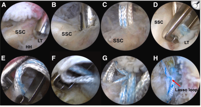 穿腱套索环肩胛下肌修复技术(Intra-articular Subscapularis Repair UsingTranstendonLasso-Loop Technique With All-Suture Anchor),针对部分撕裂及腱质较薄病例,团队创新应用套索环(Lasso-Loop)缝合方式,在关节腔内完成精准穿刺与环绕固定。该技术操作路径更为简洁,组织抓持力更强,在减少骨质损耗的同时提升了缝线对肌腱的包裹稳定性,兼顾微创性与生物力学优势。