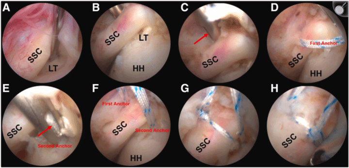 穿腱双滑轮肩胛下肌修复技术(Subscapularis Tendon Repair UsingTranstendonDouble-Pulley Technique With All-Suture Anchor),该技术采用穿腱双滑轮构型设计,通过全缝线锚钉构建对称张力分布结构,在保证腱骨接触面积的同时增强初始固定强度。双滑轮结构有助于优化受力传导,提高愈合界面的稳定性,为肩胛下肌撕裂提供了更加可靠的微创修复方案。