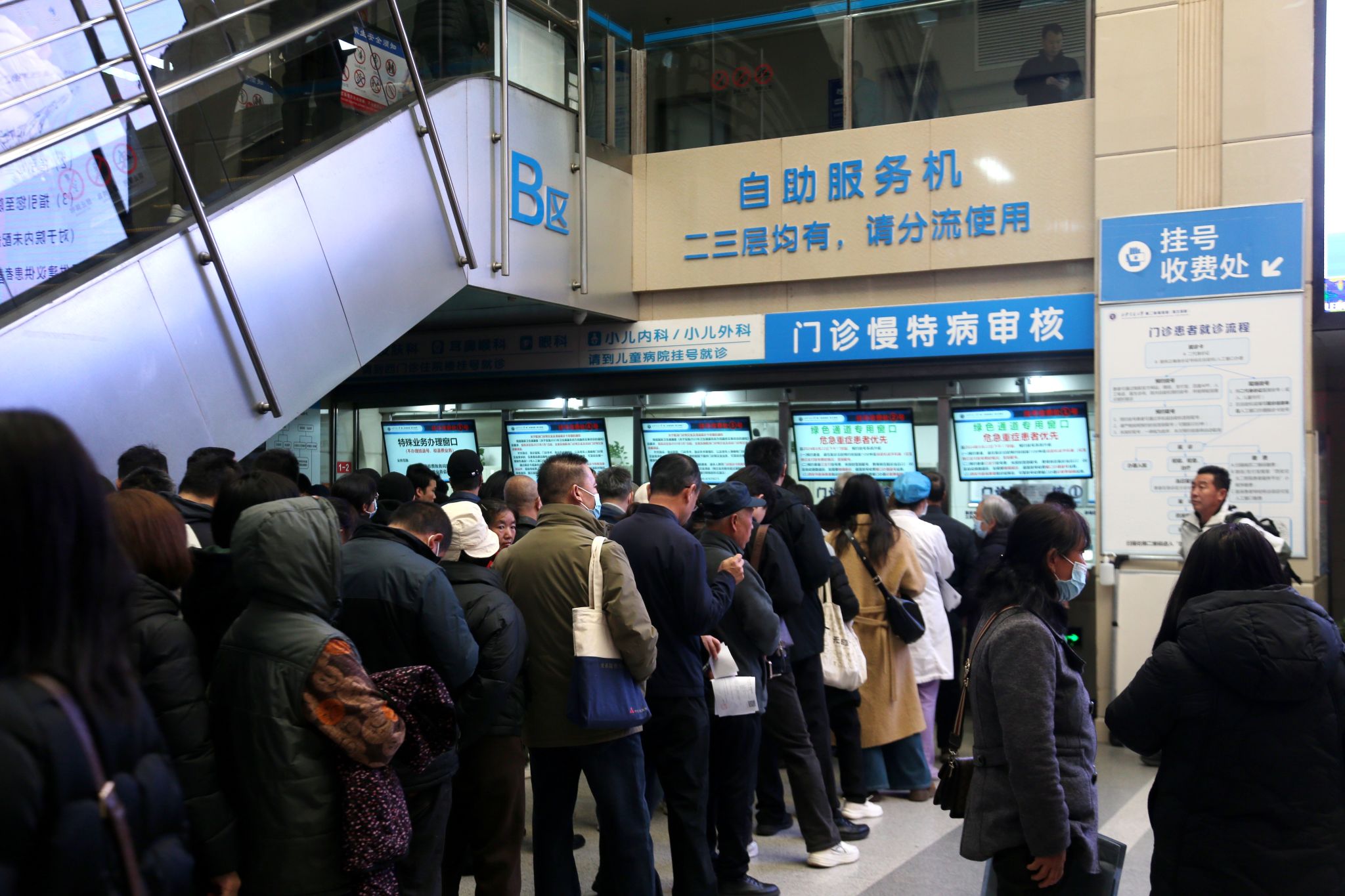 挂号收费窗口前秩序井然。针对部分患者不熟悉流程的情况,院方迅速开放所有窗口,并安排小组长深入排队区域,主动引导、耐心解释,最大限度缩短患者等候时间。