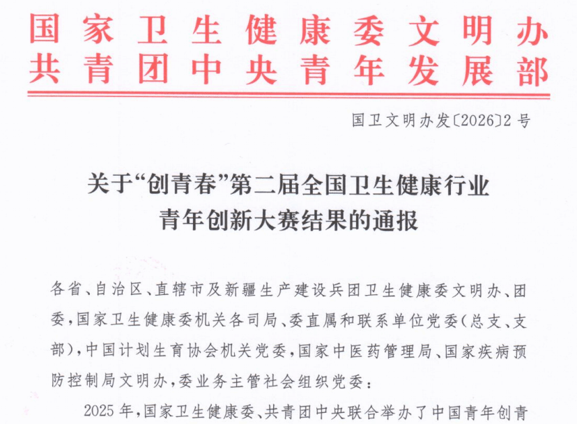 近日,国家卫生健康委文明办、共青团中央青年发展部联合发布《关于“创青春”第二届全国卫生健康行业青年创新大赛结果的通报》(国卫文明办发〔2026〕2号),我院3个青年创新项目在全国角逐中脱颖而出,斩获一银两优秀的佳绩,充分展现了我院青年医务工作者的创新活力与专业实力。