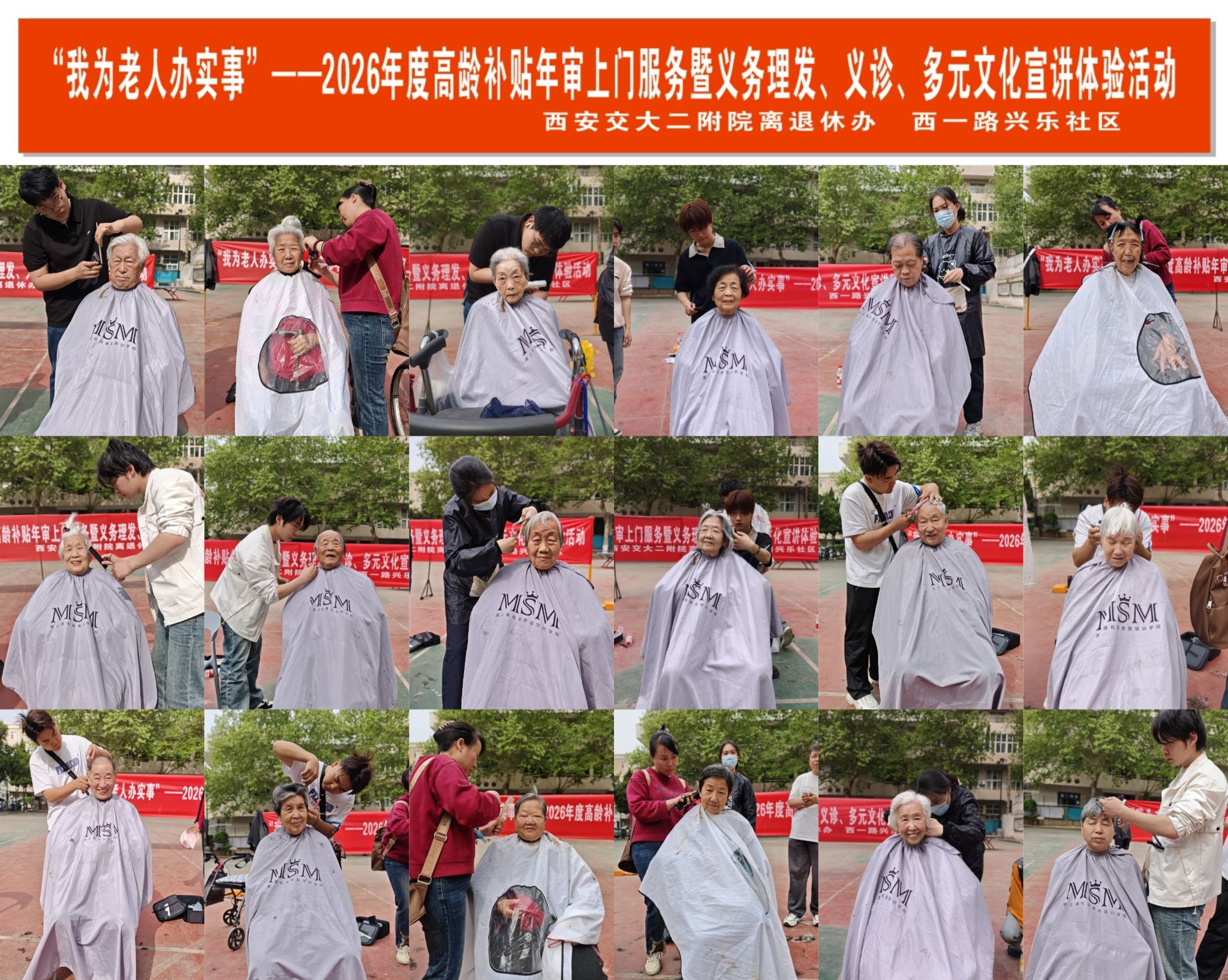 暖心助老践初心,便民服务润桑榆。为了方便离退休老人及家属,4月10日,我院离退休办联合新城区兴乐社区,在南院家属区开展“我为老人办实事”-2026年高龄补贴复审暨义务理发、义诊、反诈宣传、多元文化宣讲体验活动,当天共为离退休老人及家属完成高龄补贴复审100余人,入户复审5人次,义务理发50余人,多元文化体验50余人。将贴心服务送到家门口,为高龄老人和行动不便的离退休老人提供了便利,用实际行动守护老年群体的幸福晚年,受到离退休职工、家属及保姆普遍赞扬。