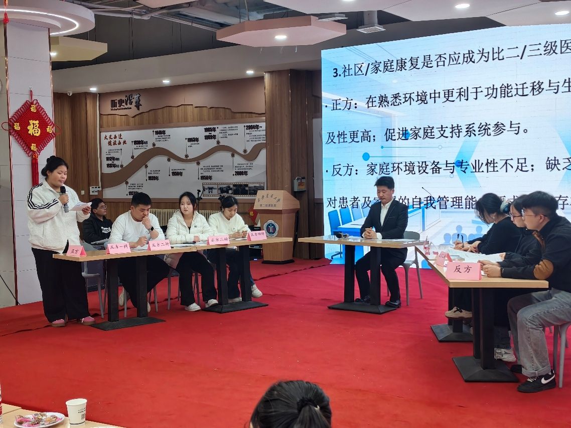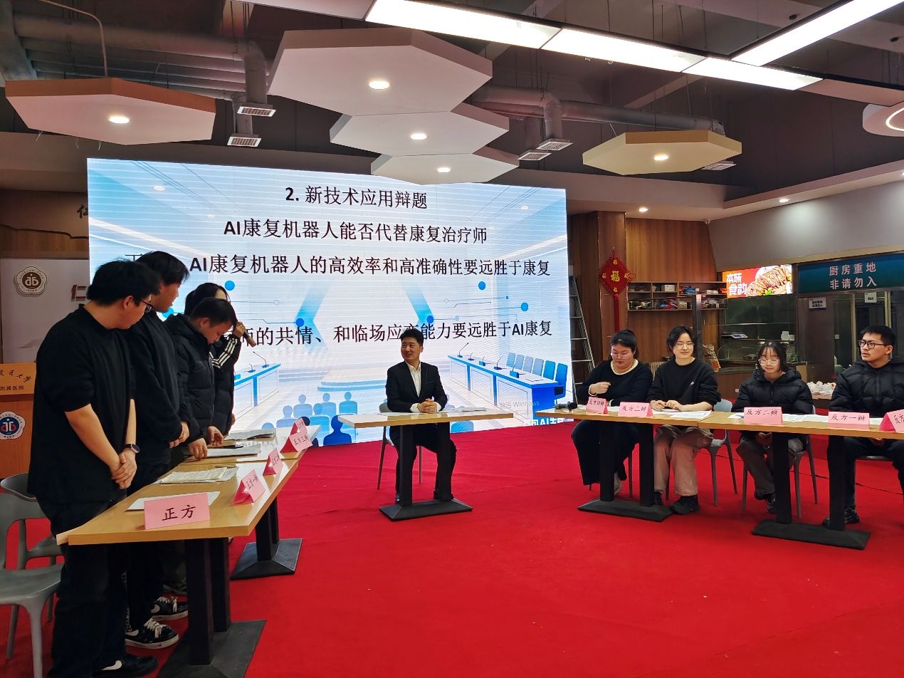 2026年2月9日下午,康复医学科于南院餐厅举办“2025——2026年度康复实习进修生辩论竞赛”活动。来自在陕西中医药大学、西安医学院、商洛学院、西安体育学院、延安大学创新学院、西安交通大学城市学院、西安思源学院、新疆科技学院、广州新华学院等9所院校的43名康复治疗实习学生分成6队进行了竞赛角逐。本次竞赛由康复医学科马奔治疗师长总体负责,治疗师组教学秘书胡冰涛、付培甲具体策划实施,全体治疗师积极配合,旨在检验康复治疗师团队半年来的教学工作,以赛促学,以赛促教。实习学生团队通过康复辩论竞赛,展示各自的实力与智慧。在比赛中运用专业知识展现“思维碰撞·真理越辩越明”。