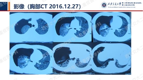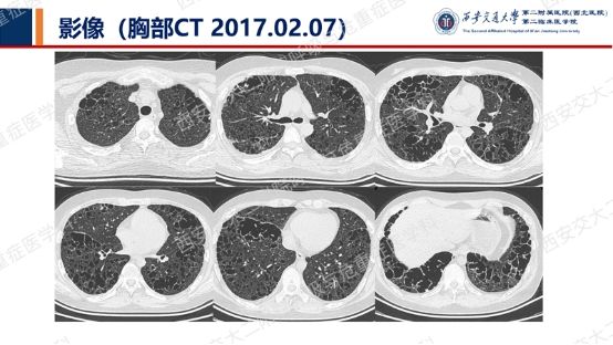 血气分析:pH 7.453,pCO2 35.6mmHg,pO2 67.4mmHg,SO2 93.9%。肺功能提示混合性通气功能障碍(FEV1/FVC 69.04,FEV1%pred 35.3),弥散功能减低,支气管舒张试验阴性。心脏及腹部超声检查未见明显异常。全身骨骼X线片未见异常。