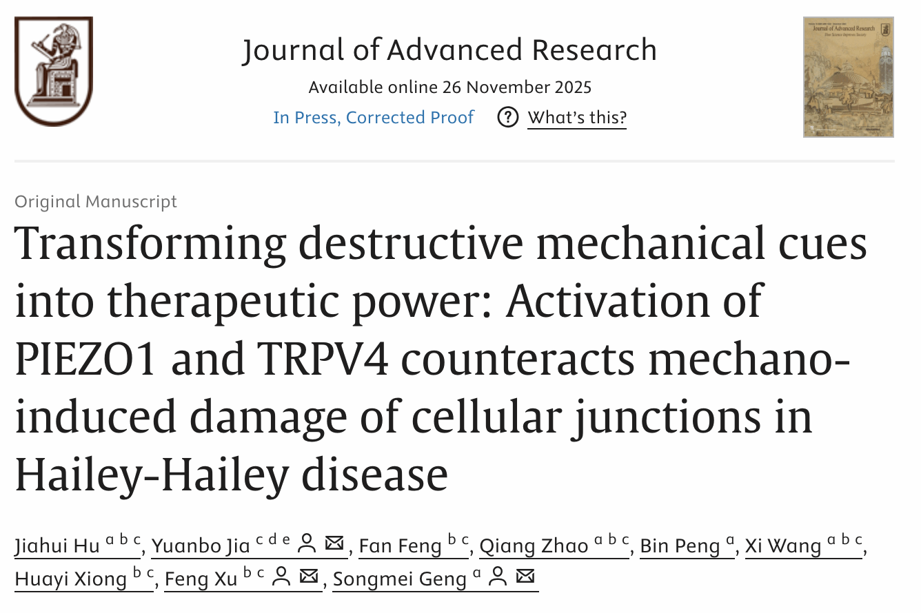 2025年11月,西安交通大学耿松梅教授团队在《Journal of Advanced Research》(IF=13.0,中科院一区TOP)发表题为“Transforming destructive mechanical cues into therapeutic power: Activation of PIEZO1 and TRPV4 counteracts mechano-induced damage of cellular junctions in Hailey-Hailey disease”的原创性研究论文[2]。该研究创新性地提出“力学治疗”概念,首次揭示通过过度激活机械敏感钙通道PIEZO1与TRPV4,可将破坏性机械刺激转化为治疗动力,从而保护HHD中受损的细胞连接。