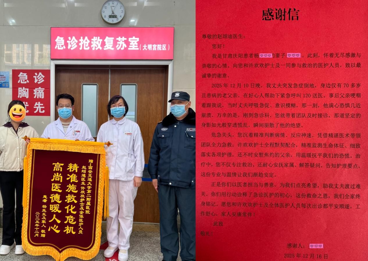 2025年12月16日,我院大明宫院区急诊科收到了一封手写的感谢信。信纸背后,是一个惊心动魄的夜晚:甘肃的杨先生突发急症倒地,被120急救车送至该院。在分秒必争的抢救中,赵翊迪医生与许欢欢护士不仅以专业迅速稳定了患者生命体征,更始终关注着家属姜女士的焦虑与无助——一句及时的病情解释,一个安抚的眼神,一次耐心的倾听,让这场生命救援充满了人性的温度。