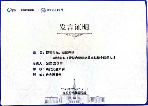 近日,由高校教学发展网络(CHED)主办、哈尔滨工业大学承办的第十二届高校教学发展网络年会在哈尔滨顺利召开。本次年会以“融合协同创新——面向未来的教与学”为主题,聚焦高等教育数字化转型背景下的教学改革与创新实践,吸引了全国各高校一线教师、教学管理人员及教学发展工作者齐聚一堂,共话教育教学发展新路径。我院心血管内科张岩副教授、邓伏雪讲师代表西安交通大学及第二附属医院,于12月27日的分会场作主题汇报,分享团队在AI赋能心血管疾病课程建设中的初步探索成果,获得与会专家学者的广泛关注与认可。
