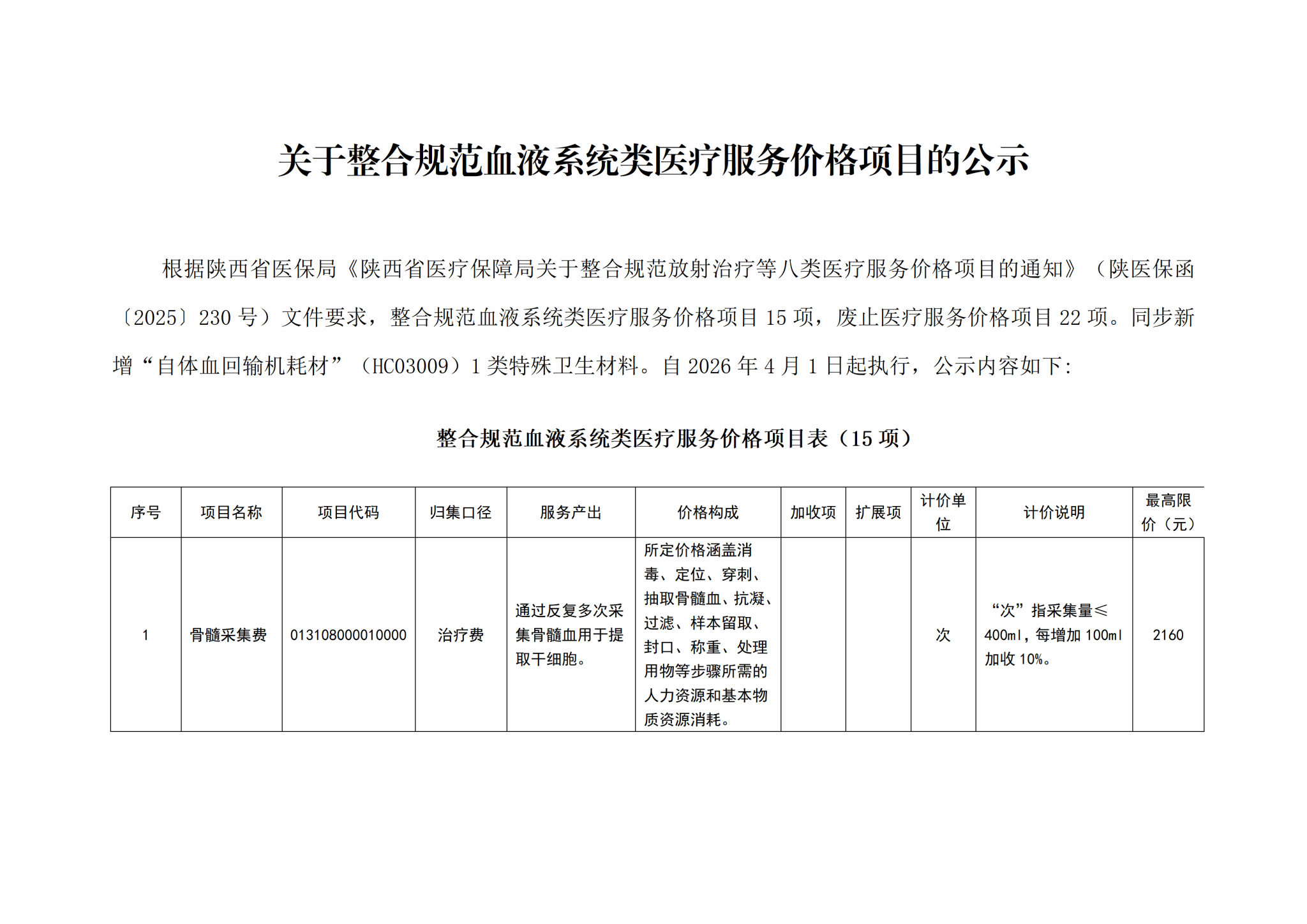 关于整合规范血液系统类医疗服务价格项目的公示