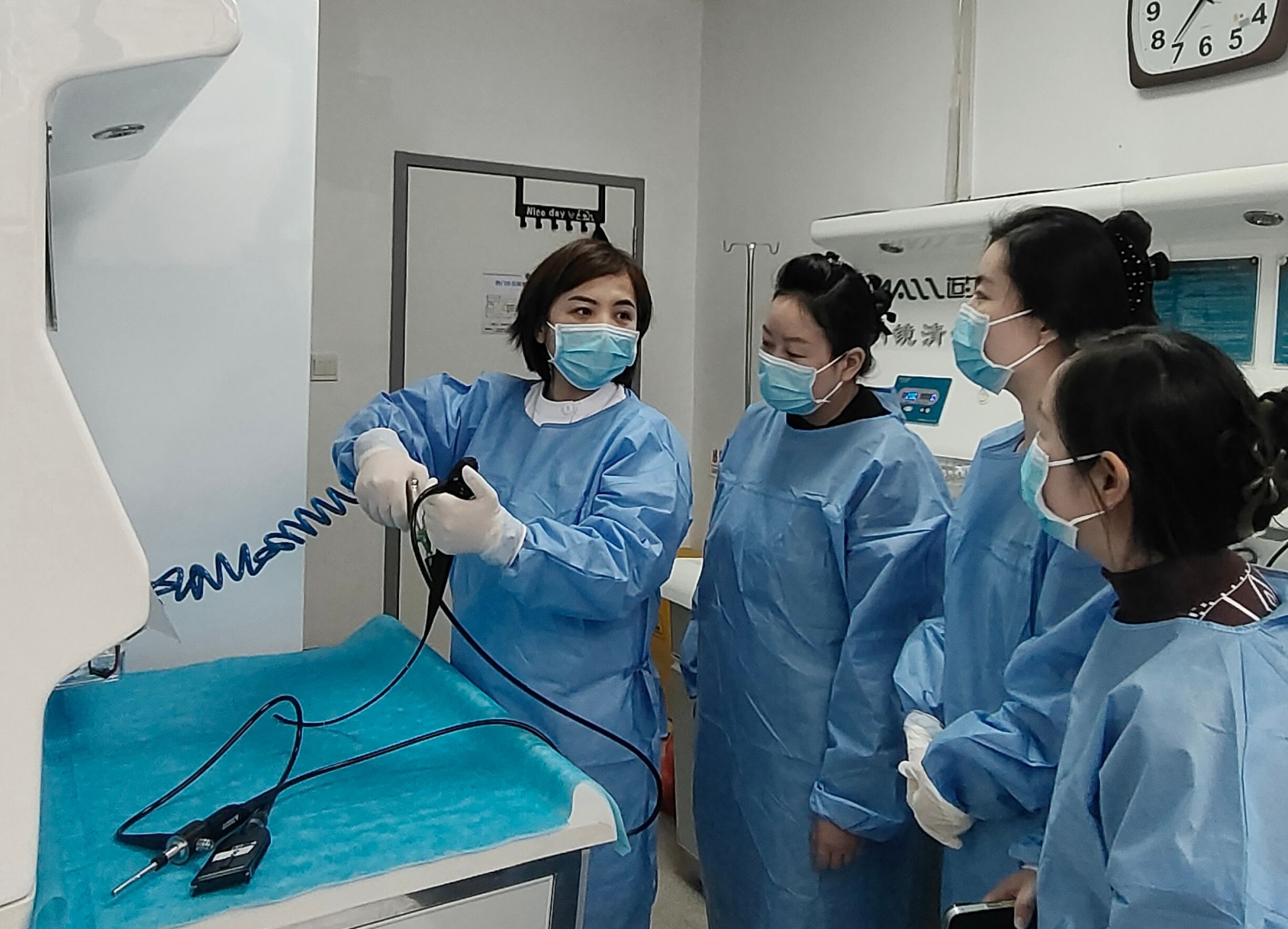 本次培训由孙斌副主任主持开幕式,任晓勇主任介绍规范化咽喉内镜室的建设,杜小滢老师带领学员参观耳鼻喉科各病区和功能检查室后,学员们就进入到紧张忙碌的实操课程培训中。