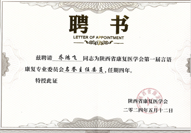 陕西省康复医学会言语康复专业委员会成立大会由陕西省康复医学会会长、我院张巧俊教授,陕西省康复医学会副会长、交大一附院乔晋教授共同主持。我院康复医学科乔鸿飞主任医师当选为名誉主委,惠艳娉副主任医师医师当选为副主任委员,席悦博士当选为常委,李艳存言语治疗师当选为常委兼秘书。
