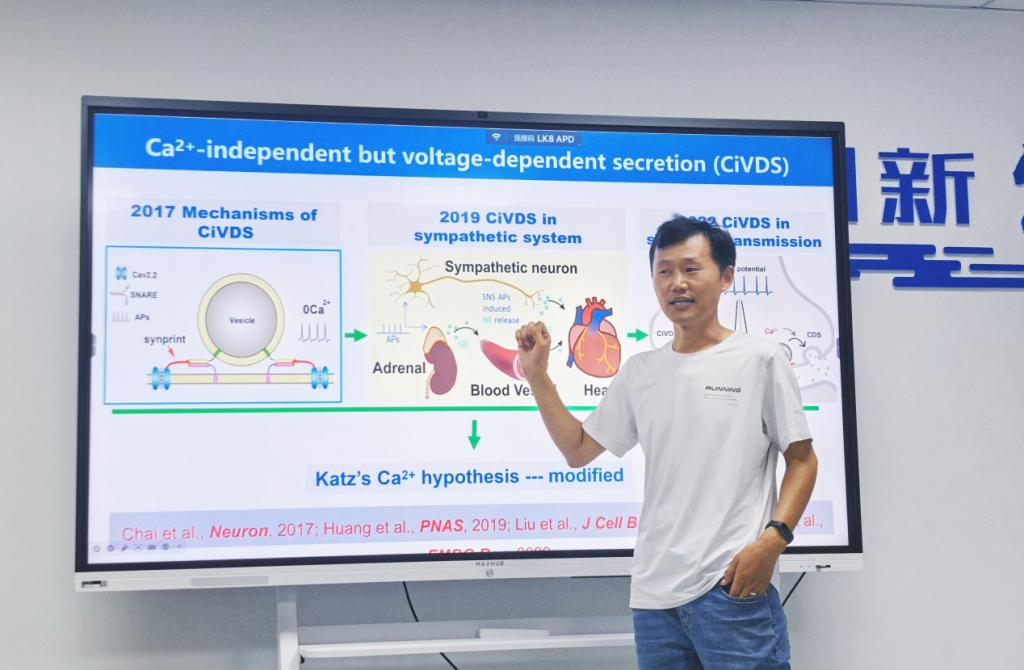随后,王昌河教授以“Physiological and pathological roles of dopamine transmission in the brain”为题,为与会者带来了一场精彩的学术报告。他运用生动的语言和丰富的图表,深入浅出地阐释了多巴胺在大脑中的生理与病理作用,并分享了自己团队的发展史以及在相关领域的研究成果和未来研究方向。王教授的报告研究深入、内容新颖详实、见解独到,赢得了在场人员的阵阵掌声,大家表示深受启发、受益匪浅。
