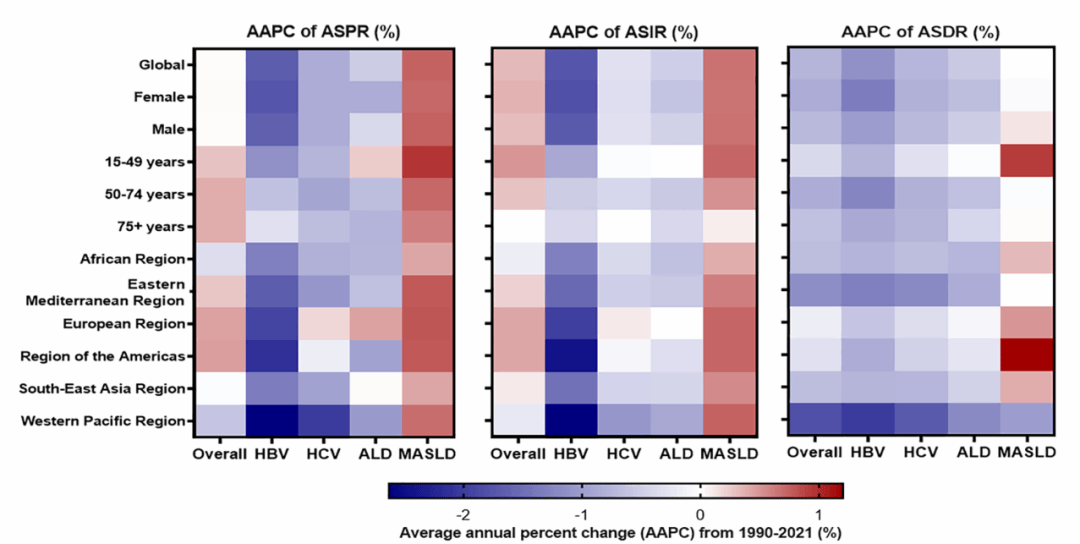图9. 1990年至2021年CLD的ASPR、ASIR和ASDR的平均年百分比变化(AAPC),总体以及按性别、年龄、WHO区域和肝病病因分组