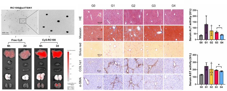 图11. RC100@siITSN1的制备、表征、体内靶向性检测以及对CCL4诱导肝纤维化C57BL/6小鼠治疗疗效评价