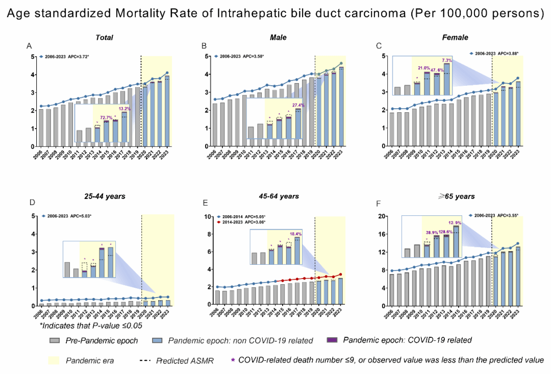 肝内胆管癌相关ASMR显著上升,尤其是老年和男性群体,而肝外胆管癌的变化较为平稳。新冠大流行未对肝管癌死亡率产生明显的影响。