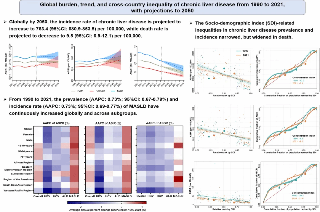 研究结果强调了需要采取有针对性的干预措施和策略,以应对全球CLD负担的不平等现象,特别是关注MASLD的管理、年轻人群(15-49岁)以及社会人口不平等问题。