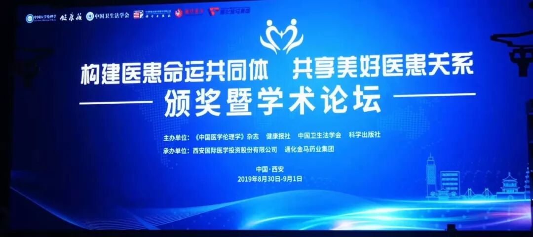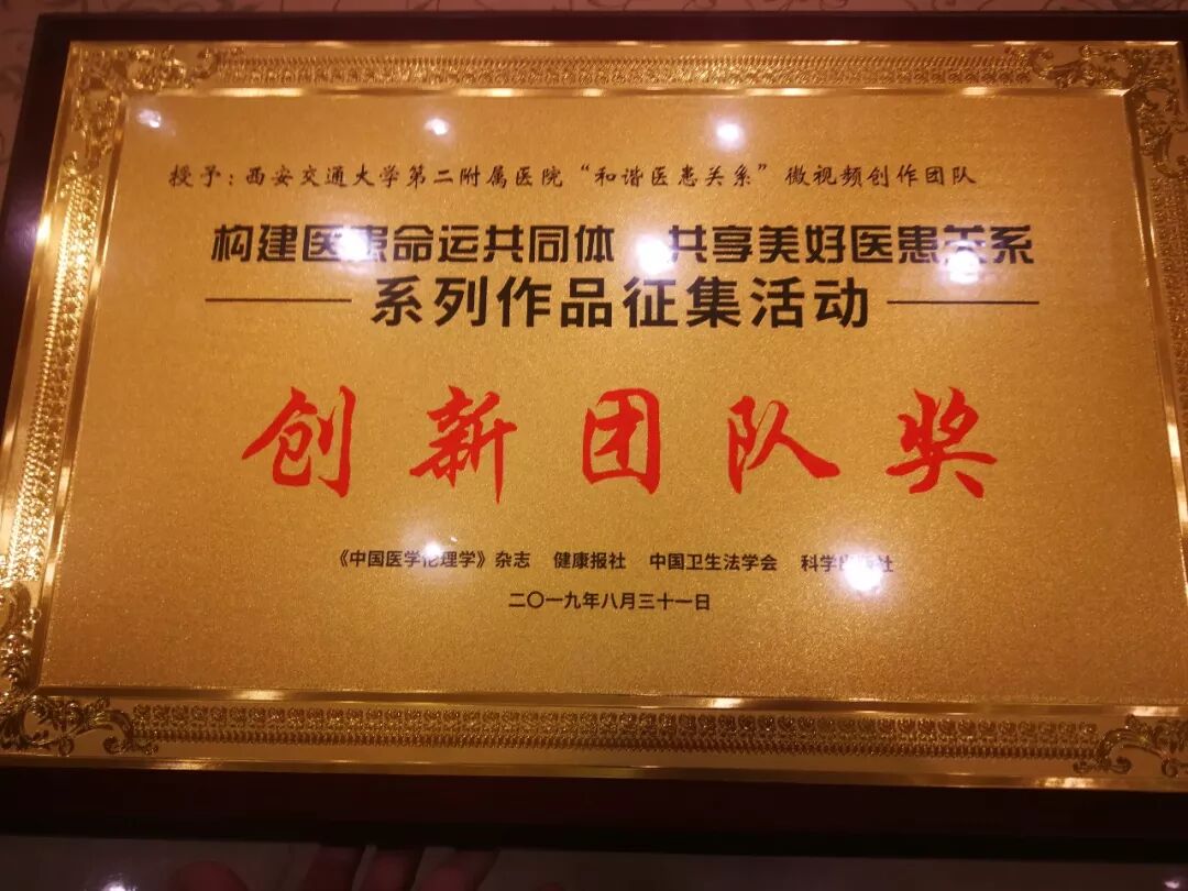 2019年8月31日,由《中国医学伦理学》杂志、健康报社、中国卫生法学会、科学出版社主办的“构建医患命运共同体 共享美好医患关系”颁奖暨学术论坛在西安举行,我院团委“和谐医患关系”微视团队和《先行者》等6部微视作品载誉而归。
