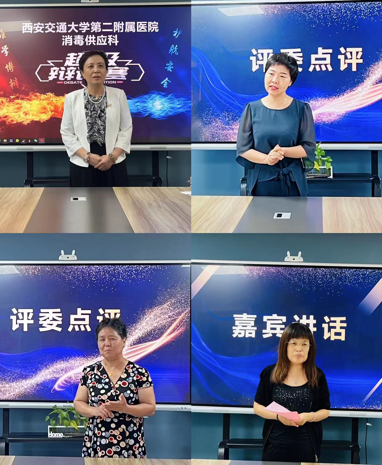 唇枪舌战,硝烟弥漫;口若悬河,辩出自我。为提升员工思辨能力,激发员工自主思考的能力,消毒供应科举办“雄学博辩 护航安全”辩论赛。竞赛特别邀请到感染管理科李金娜主任作为嘉宾,西安交通大学口腔医院彭军老师、西安市中心医院惠再娥老师、我院手术室赵丽燕老师作为评委全程参加了辩论赛。
