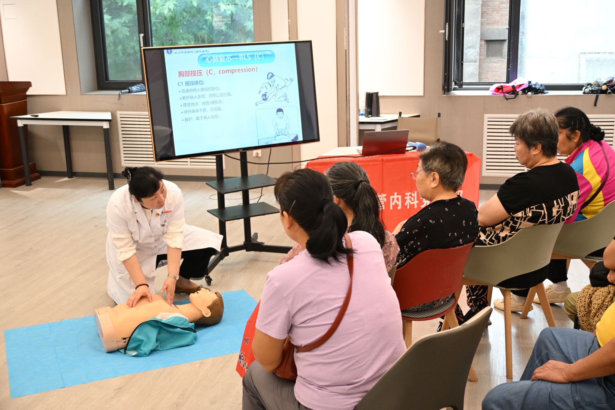 来自老年神经内科支部书记张有友医生首先带来了题为《守护“生命中枢”——脑卒中健康科普》的精彩讲座,用通俗易懂的语言讲解了脑卒中预防与保健知识,吸引了大量中老年居民驻足聆听;临床营养科石海丹医生现场为大家讲解减油、增豆、添奶的必要性及实操办法。接下来的急救技能培训更是气氛热烈,老年心血管内科副主任叶莎副教授通过模拟人现场演示,手把手指导居民掌握心肺复苏;耳鼻咽喉科陈勃言护师科普了鼻出血的正确处理方法,极大提升了居民在突发事件中的自救互救能力,完美契合了“协同救护,应急有方”的活动主题。