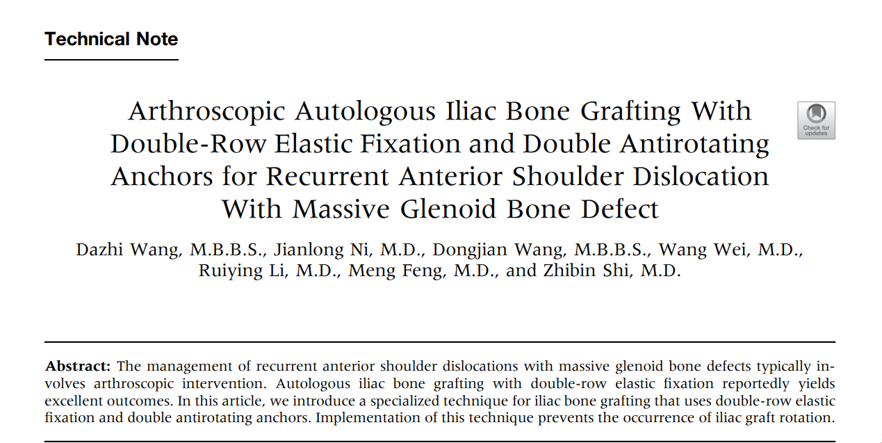 2024年5月22日,我院骨科中心-运动医学科时志斌教授、倪建龙副教授团队原创手术技术在骨科运动医学领域顶刊《Arthroscopy: The Journal of Arthroscopic and Related Surgery》旗下手术技术类期刊《Arthroscopy Techniques》正式发表,首次介绍了双袢双锚钉防旋技术在复发性肩关节脱位中的应用,相关手术视频及文章已可在PubMed及期刊网站上公开下载,标志中国医生在肩关节疾病的理念创新、手术技术等方面得到了国际同行的肯定,我院运动医学团队在肩关节脱位的诊治方面已达到国际先进水平。