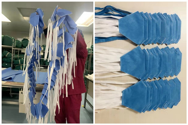2月5日在西安市交大二附院消毒供应科,23名医护人员穿戴无菌衣帽,拿着手术刀,踩着缝纫机,利用医用包装无纺布自己动手制作口罩,以缓解医院口罩库存紧缺问题。在洁净的库房里,他们分工明确,从裁剪、缝纫到修边、打包,尝试制作第二天便开始进入流水化作业。口罩从第一版明线缝制到第二版采用暗线,再到第三版的鼻夹应用,日臻完美。