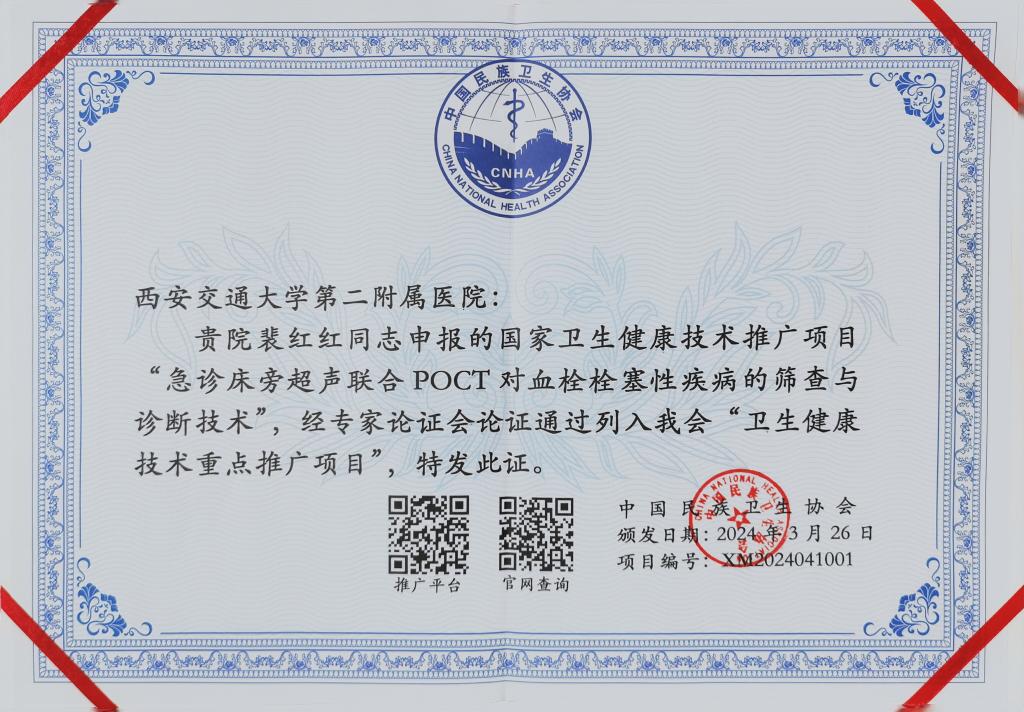 近日,由我院急诊科裴红红主任主持申报的“急诊床旁超声联合POCT对血栓栓塞性疾病的筛查与诊断技术”国家卫生健康技术推广项目已经通过专家论证会论证,被列入中国民族协会“卫生健康技术重点推广项目”,同时该项目通过了国家卫健委流动人口服务中心审查,并由中国民族卫生协会遴选推荐,成功入选国家卫生健康技术推广应用信息服务平台技术备选库。