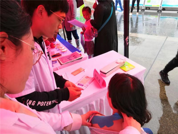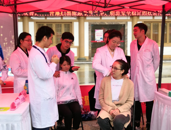 现场群众络绎不绝,雷晓辉治疗师为患者家属讲解脑外伤术后重症康复治疗早期开展原则和基本治疗;黎耀峰治疗师在现场为一膝关节损伤患者检查治疗;胡冰涛治疗师在一名颈肩痛上班族治疗时接受网易新闻直播记者的参访。持续不到2个小时的活动共咨询和义诊患者50余人次,包括了常见的颈肩痛、脑外伤康复、儿童发育迟缓、卒中后吞咽障碍等。