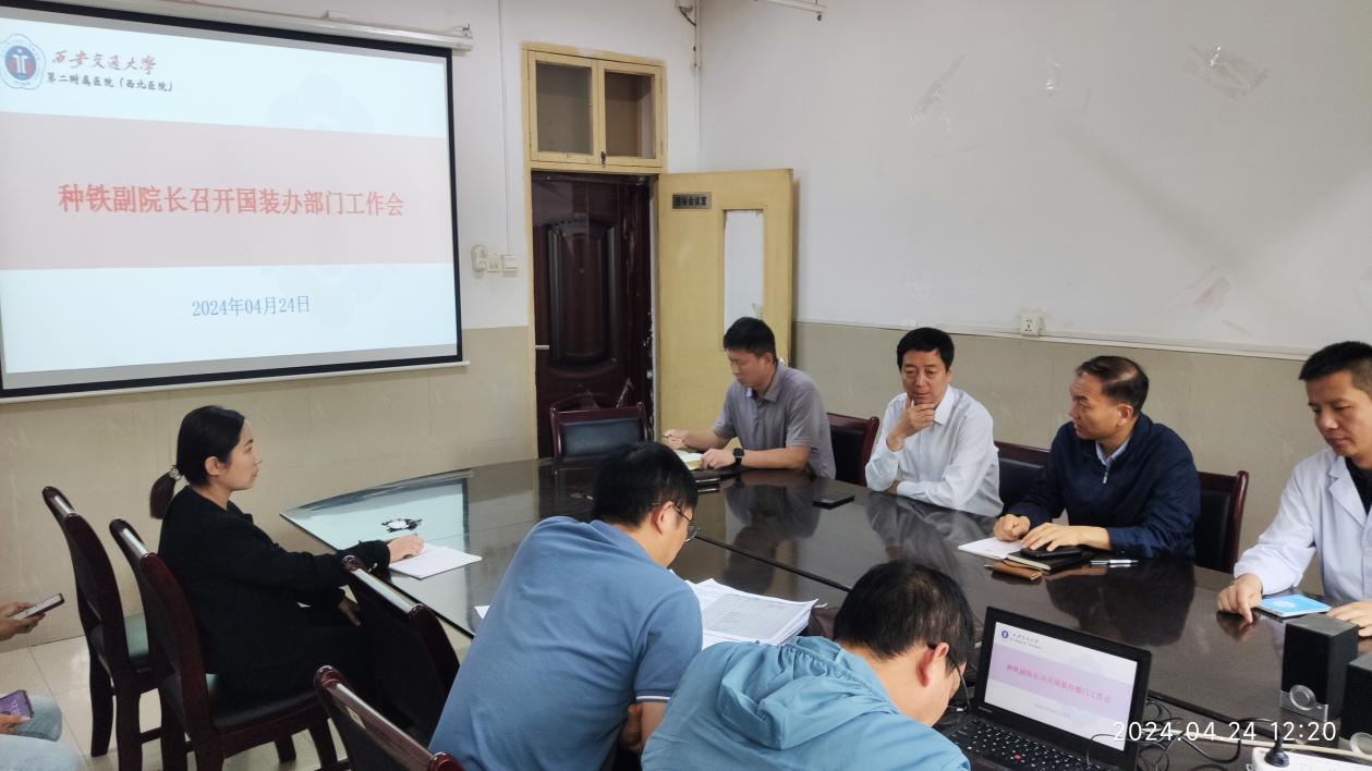 4月24日上午11点30分,种铁副院长在国有资产与医学装备管理办公室(以下简称国装办)二楼会议室召开部门工作会,国装办全体30余人参会,会议由国装办主任叶泽宇主持。
