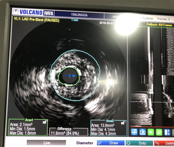 5月7日下午,由邓捷主任医师、薛嘉虹副主任医师、万招飞主治医师、李青主治医师、张荣主管护师、段文娜护师组成的冠脉介入治疗团队为尹女士采用全新的冠状动脉旋磨术。在完善相关术前检查后,邓捷主任医师用娴熟的技术术中先为血管打通一个“隧道”,使用带有超高速旋转头的转头将冠脉钙化斑块碾磨成细小的微粒,将血管腔内的斑块消除。经过几次旋磨后,阻塞血管腔的钙化斑块被逐渐消除,被磨成极其微小的颗粒,随血液循环至血管远端并通过毛细血管床吸收,之后完成冠状动脉支架置入手术。植入支架后为其行冠状动脉血管内超声发现血管狭窄解除,效果显著。