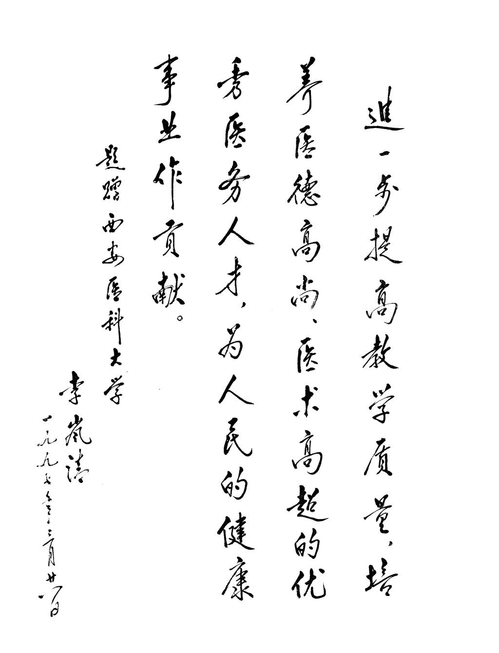 八十年,情系民众健康,大医大义,仁心仁术。艰难困苦,玉汝于成,历经沧桑磨砺,成就国家西北医学中心,成为三秦父老、西部民众信赖和托付性命的守护神。名医荟萃、德艺双馨,无影灯下展风采;非典甲流,汶川玉树,大爱无疆施仁术;援疆援藏,国际救援,大义于胸担道义。刘蔚同、陈向志、董淑芬、王世臣、杨鼎颐等一代名医竞显风流,万千后学敬仰,执着追随,救死扶伤,护佑健康。