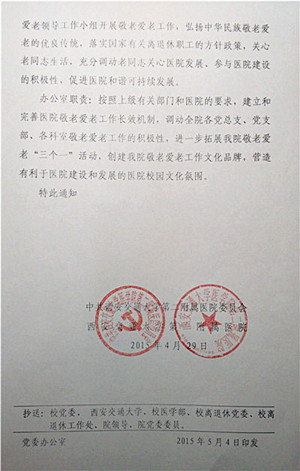 为了有效应对老龄化趋势,进一步做好新形势下医院离退休工作,把医院对老同志的关心和关怀落到实处,一年来,我院根据党中央、教育部和学校相关文件精神,围绕建立和完善我院敬老爱老工作长效机制做出了有益的探索和实践,并取得了可喜的成绩。2015年5月4日,《关于成立我院敬老爱老工作领导小组的通知》(西交二院党发〔2015〕15号)文件的发布,标志着我院敬老爱老工作长效机制体系构架自下而上的完整建立,也表明我院敬老爱老工作进一步深化并全面推进。