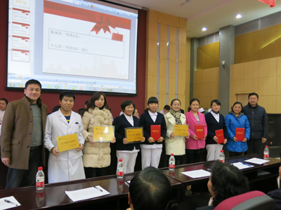“医保知识竞赛”决赛由复赛前六名的6个部门代表队肿瘤外科、门诊部、小儿内科、手术室、普外科、妇产科共18人参加比赛,医保合疗办新农合组组长张博文和审核组组长孙瑜承担竞赛主持,竞赛以科室为单位抢答答题为主,竞答现场紧张而有序,气氛非常热烈。参赛选手个个胸有成竹、镇定自若,面对提问,对答如流,博得了观众阵阵掌声。在观众互动环节,台下观众都踊跃地举手积极回答问题,现场的气氛达到了高潮。经过紧张激烈的角逐,肿瘤外科代表队荣获医保知识竞赛集体一等奖,小儿内科、门诊部代表队荣获集体二等奖,普外科、手术室、妇产科代表队荣获集体三等奖,耳鼻喉科、皮肤科、神经外科、中医科代表队荣获集体优秀奖。普外科逯云获得医保知识竞赛个人一等奖,普外科白育花、眼科赵敏获得个人二等奖,手术室张红、肿瘤外科包兴、手术室马晓颖获得个人三等奖,小儿内科井亚丽、财务部钱铖、门诊部李兴利、神经外科高炀、中医科赵悦、耳鼻喉科罗花南获得个人优秀奖。高亚副院长和评委组为获得荣誉的科室和个人颁奖,并向他们表示祝贺。