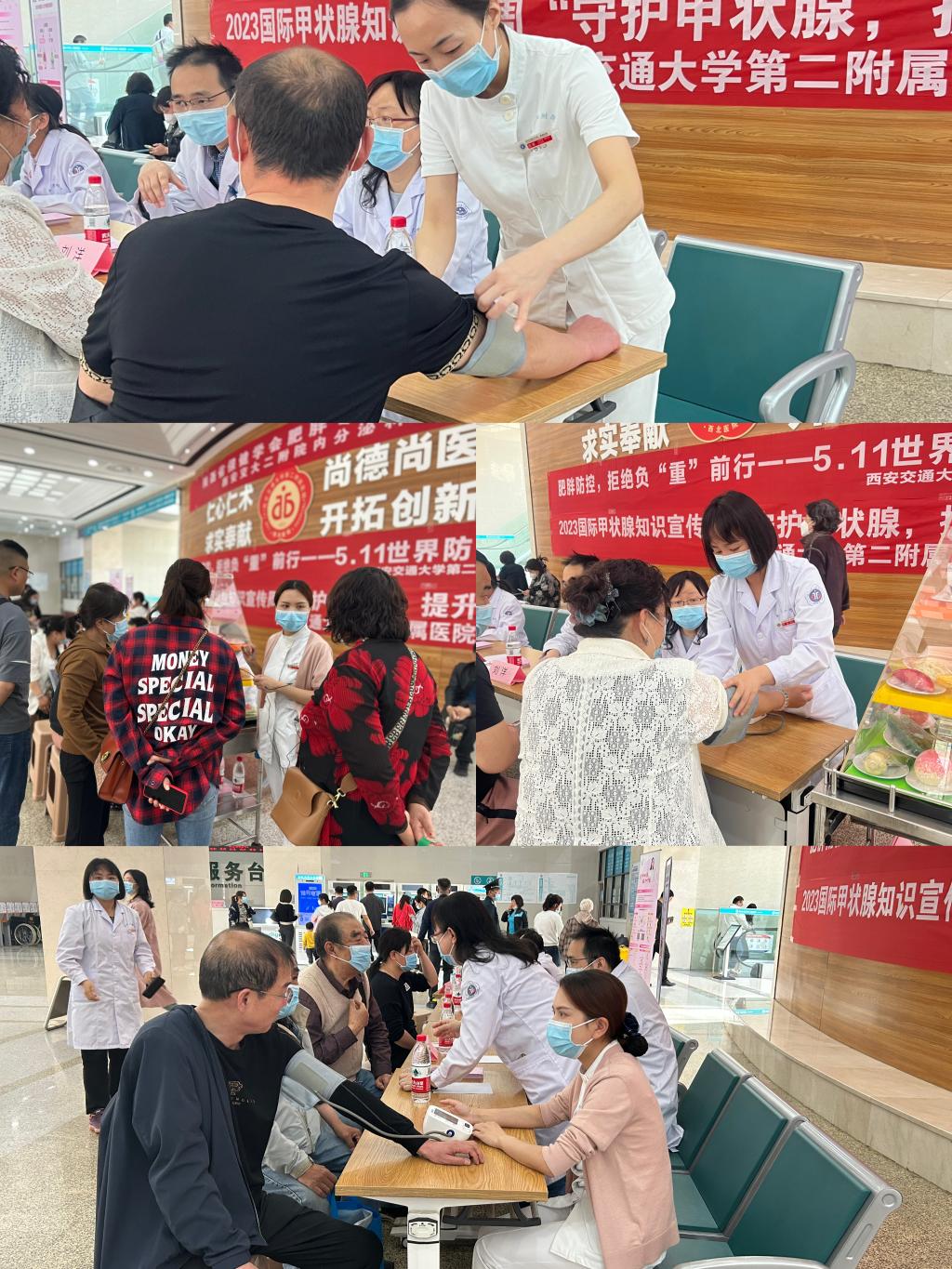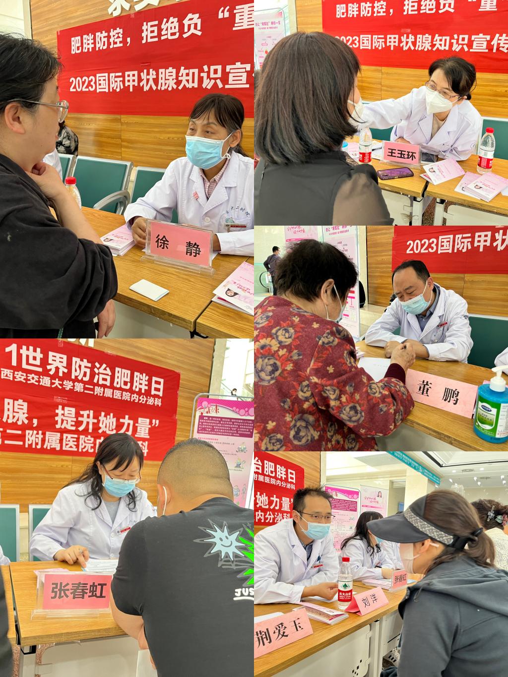 近年来,随着生活节奏的加快,工作压力的增强,甲状腺相关疾病患病率呈逐年上升趋势,严重影响公众健康。肥胖及其引发的糖尿病、心血管疾病、肿瘤、社会心理问题等已成为我国乃至全球最严重的公共健康问题,因此,为提高公众的甲状腺及肥胖的健康意识,普及甲状腺疾病及肥胖相关知识。2023年5月12日上午,内分泌科联合普外科在我院大明宫院区门诊大厅举行“肥胖防控,拒绝负‘重’前行”,“守护甲状腺,提升她力量”为主题的肥胖、甲状腺义诊宣传活动。