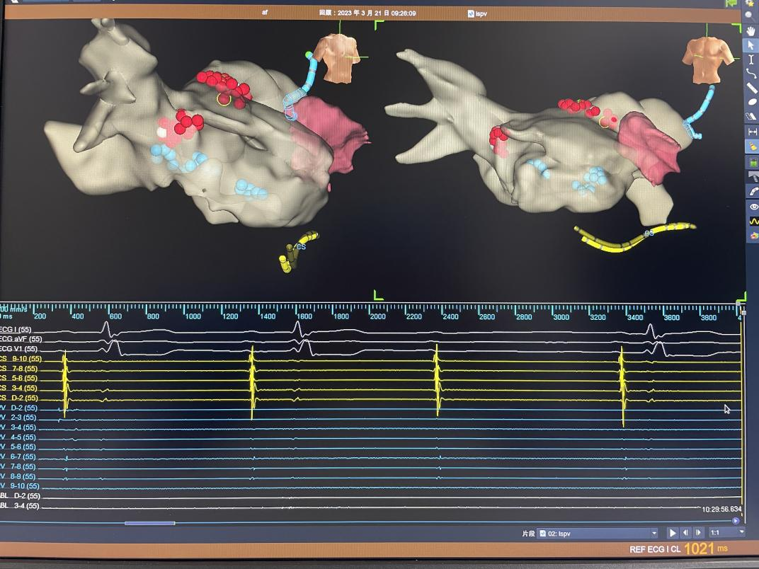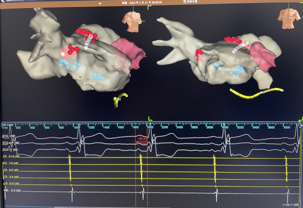 术中,对患者进行左心房三维建模,标测到患者静息情况下PR间期明显延长,同时伴有二度房室传导阻滞。