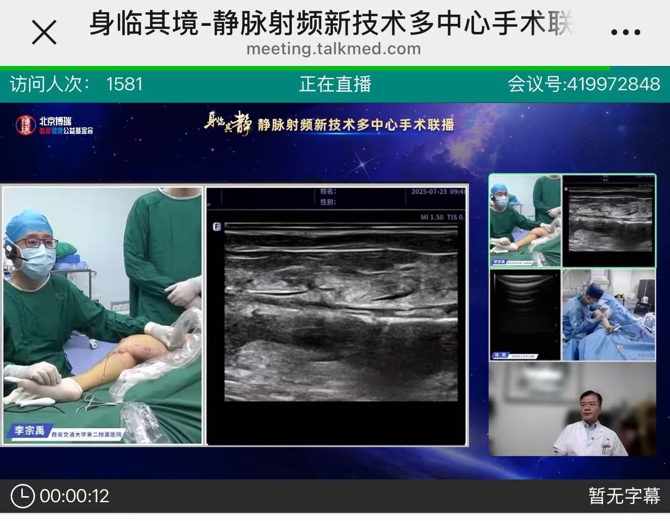7月23日--24日由陕西、北京、河北、成都、长沙、上海、广州、浙江全国多家医院联合开展的“静脉射频新技术多中心手术联播”在云端拉开帷幕。血管外科马建仓主任作为联合主席之一,带领团队进行了两台下肢静脉曲张手术的直播演示,整个过程行云流水,医、护、麻醉各个环节间的紧密配合,手术医生高超的技艺,彰显了我院的综合实力,获得全国专家一致赞誉。