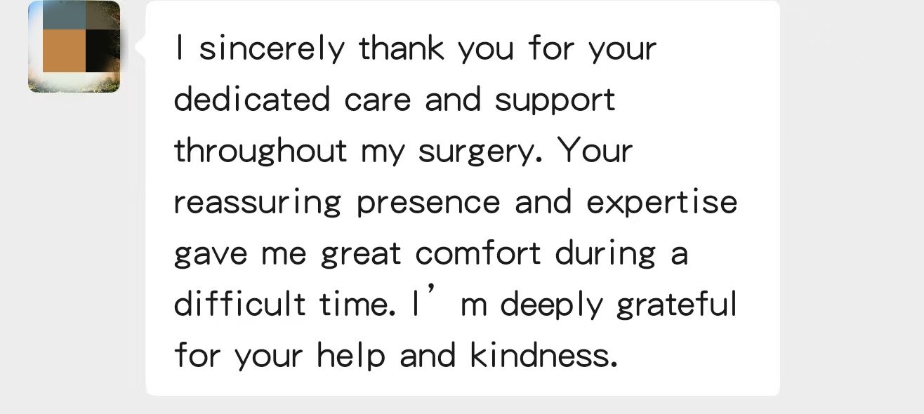 “衷心感谢您在手术期间给予我的尽心照顾与支持。您专业的医术和温暖的安抚,让我在艰难时刻倍感慰藉。”近日,我院老年普通外科收到来自西安交通大学化学学院巴基斯坦留学生WASIM的感谢留言,医护团队凭借精湛的医术和细致的护理,帮助他顺利康复。这份跨越国界的认可,既是对我院医疗水平的肯定,也展现了医患之间的真挚情谊。