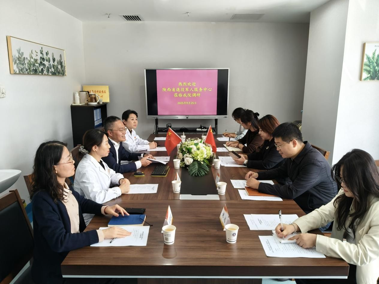 9月25日下午,陕西省退役军人服务中心副主任宋亚军、贺昊一行莅临我院走访调研,健康服务部部长贺裕雯、综合协调部干部姚远、健康服务部干部白莹参加调研。我院副院长刘明、门诊部主任王丽娟、医保办主任曹婷、药学部副主任王娜、医务部副主任同艳妮参会。会议由同艳妮副主任主持。