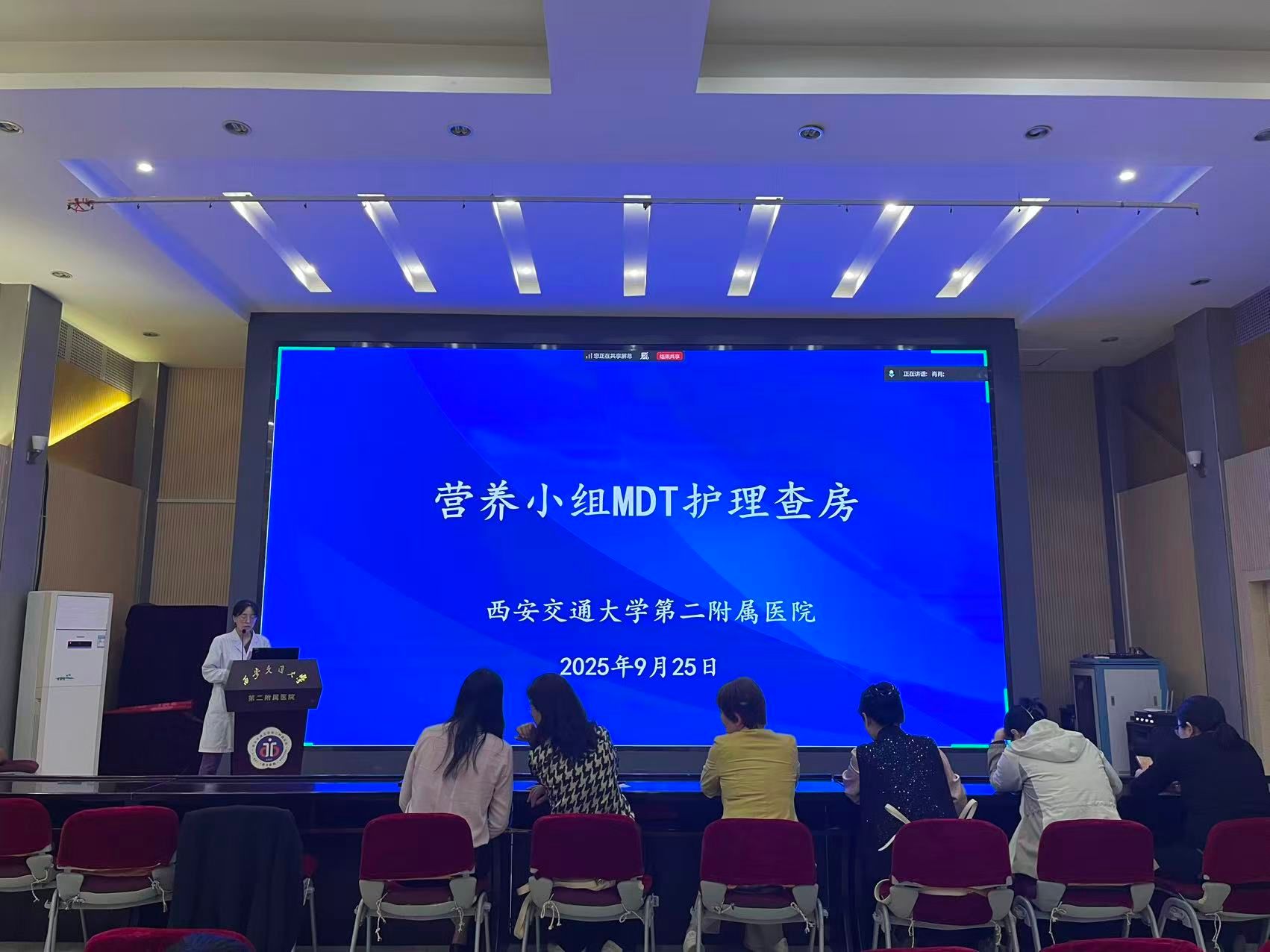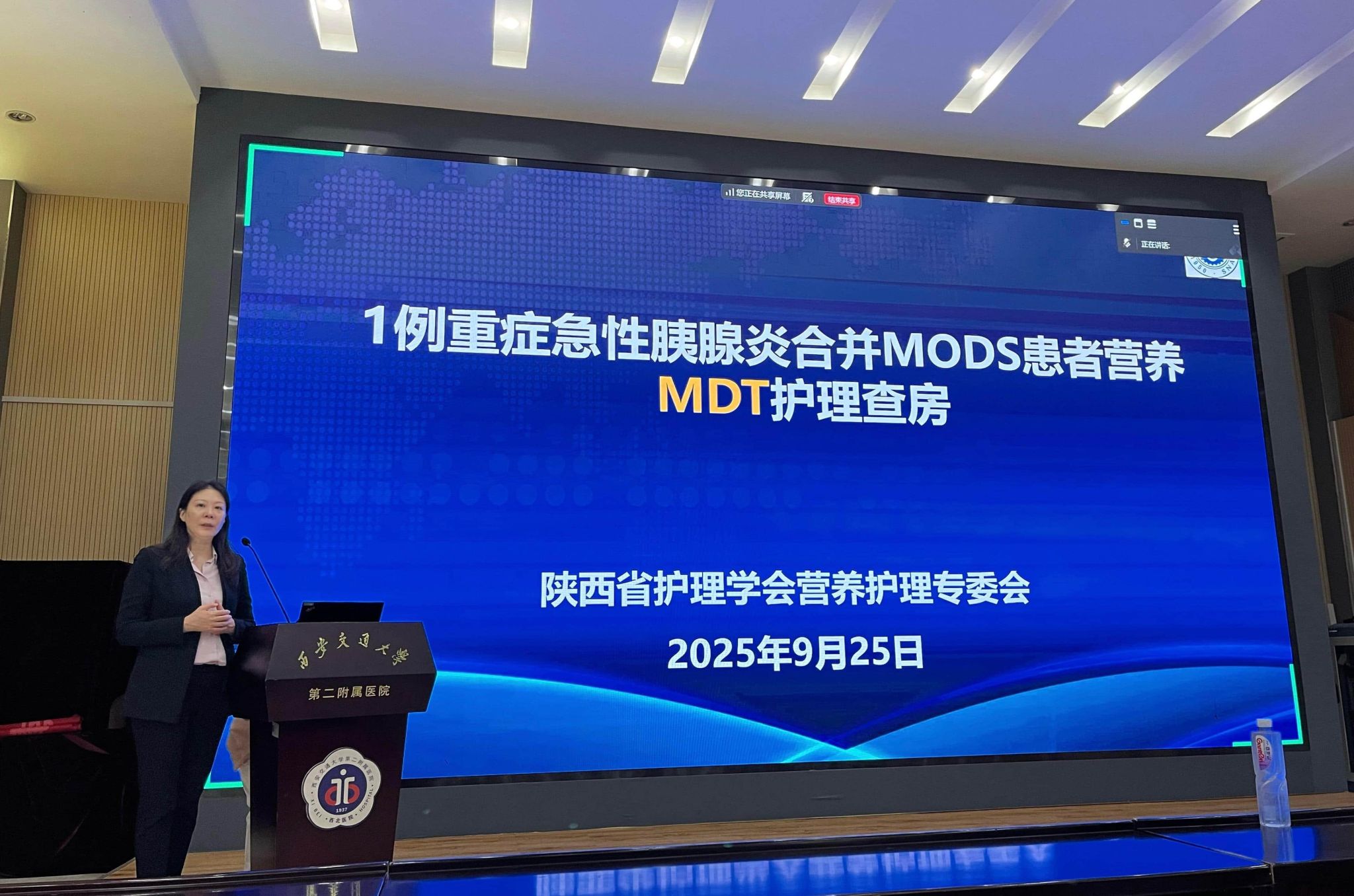 营养是疾病康复的“隐形基石”,科学的营养支持能为患者康复注入关键动力。为纪念抗战迁陕88周年,繁荣学术,进一步提高临床护理质量,全面了解患者的病情,为患者提供全面优质,全程个性化的护理服务,9月25日下午由陕西省老年与慢性病营养护理学会主办,西安交通大学第二附属医院重症医学科承办的“1例重症急性胰腺炎合并MODS患者营养MDT护理查房”在我院南院多功能厅进行。参加本次查房的有陕西省老年与慢性病营养护理学会赵小红主委、丁妮秘书长,消化科杨会护士长,陕西省营养护理学会的委员们、我院急重症专科小组联络员及院营养专科小组联络员线上线下近百人参加了此次查房。