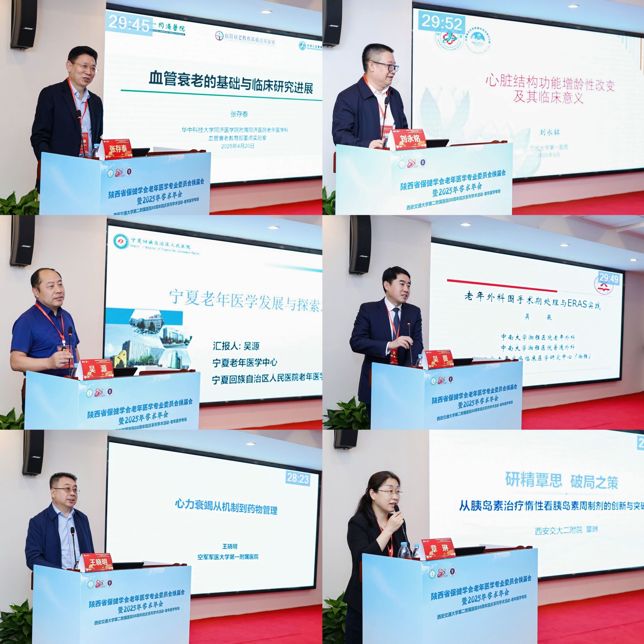 学术讲座环节,多位知名专家分享了老年医学领域的热点问题及最新进展。华中科技大学同济医学院附属同济医院张存泰教授探讨了血管衰老的基础与临床研究进展;兰州大学第一医院刘永铭教授阐述了心脏结构与功能的增龄性改变;宁夏回族自治区人民医院吴源教授分享了宁夏地区老年医学的建设经验;中南大学湘雅医院吴畏教授讲解了老年外科围手术期处理与ERAS实践要点;空军军医大学西京医院王晓明教授从心力衰竭机制出发探讨了药物管理策略;西安交通大学第二附属医院章琳教授从“胰岛素治疗惰性”这一临床挑战出发,分析了胰岛素周制剂的创新与突破的价值。讲座内容详实、深入浅出,为参会者提供了宝贵的知识与经验。