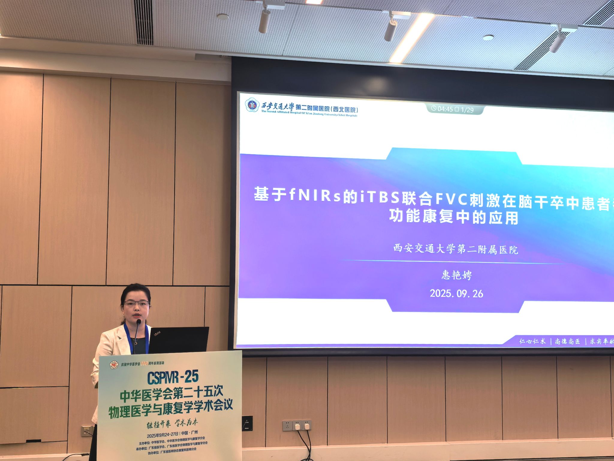 在脑功能研究与神经调控技术应用方面,科室报告了一系列创新性研究。乔鸿飞主任在论文发言中汇报了《基于fNIRS的口腔内电刺激对脑卒中后吞咽障碍康复效果的影响研究》,进一步深化了吞咽障碍的精准评估与治疗。袁海峰教授的口头发言《fNIRS联合ERP检测在PSD疗效评估中的应用》,则展示了多模态神经生理技术在康复疗效评价中的价值。惠艳聘副主任就《iTBS联合FVC改善脑干卒中患者吞咽功能障碍:一项基于fNIRs的临床研究》进行口头发言,探讨了脑神经调控技术与康复治疗结合对吞咽障碍的疗效及其机制,创新了吞咽障碍康复新方法。此外,王斌治疗师报告了《利用fNIRS技术观察前交叉韧带重建术后患者大脑运动功能区变化的研究》,为运动损伤的中枢机制提供了新见解。