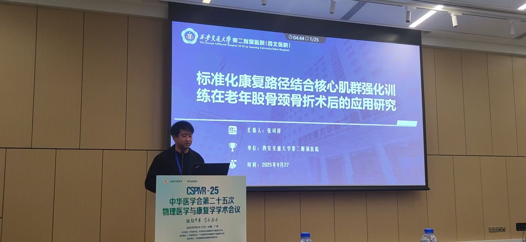 在康复治疗模式与患者体验方面,晏光林治疗师分享了《小组团体作业活动对于住院患者康复满意度和体验感的效果观察》,体现了科室对患者心理社会康复的重视。张司铎治疗师报告了《标准化康复路径结合核心肌群强化训练在老年股骨颈骨折术后的应用研究》,展示了科室在老年骨科康复标准化、精细化方面的实践成果。樊城汇报了《基于任务态功能磁共振研究医学生正念冥想的负性情绪调节机制》,则将康复理念延伸至压力管理与心理健康促进领域。