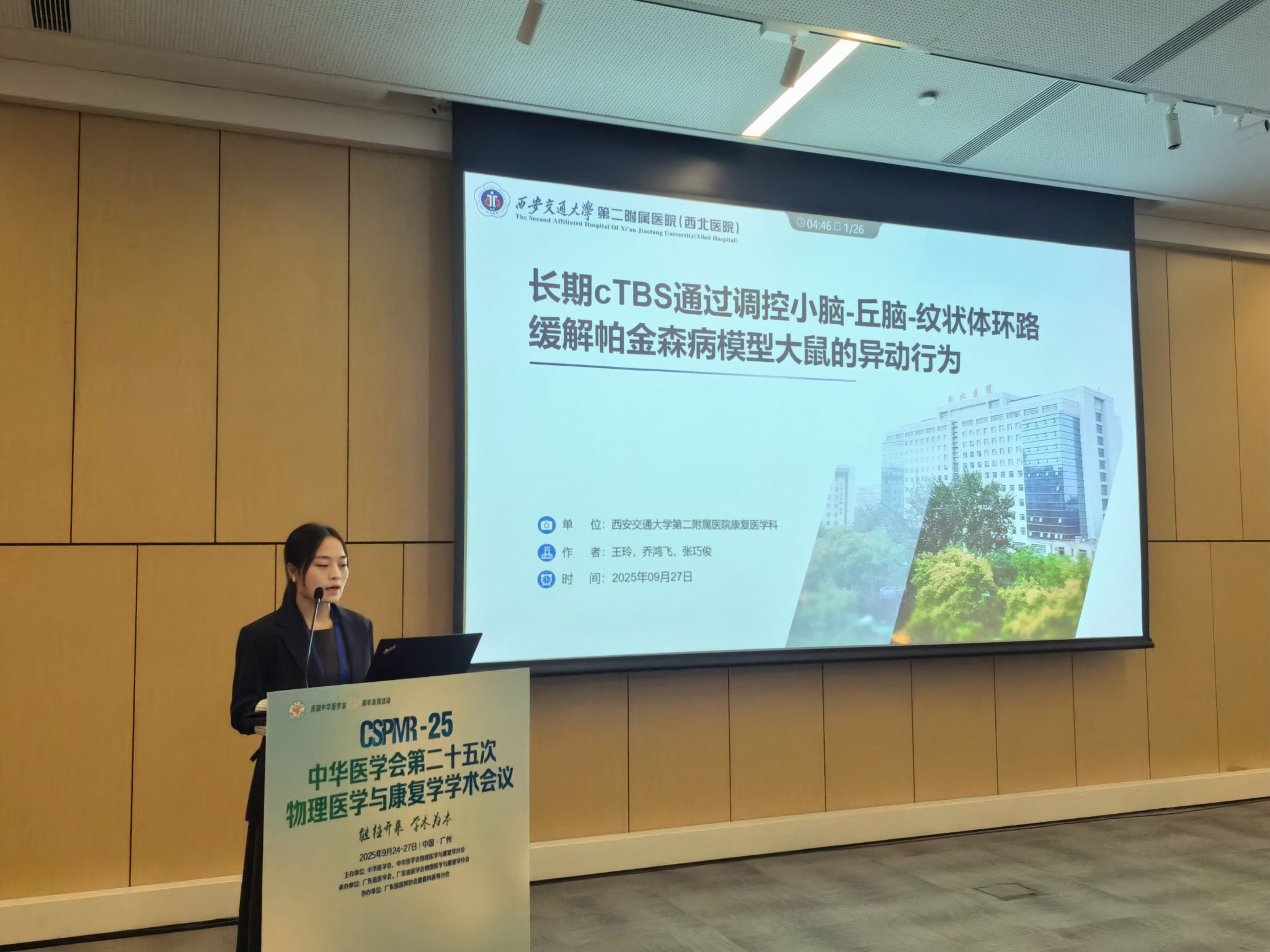 在神经疾病康复领域,科室的基础与临床研究同样亮点纷呈。王玲博士汇报了《长期cTBS 通过调控小脑-丘脑-纹状体环路缓解帕金森病模型大鼠的异动行为》,关注cTBS对异动行为的环路调控作用。王忆璇博士汇报了《前扣带皮质AMPA受体GluR1亚基在rTMS改善帕金森病大鼠记忆障碍中的作用及机制》,聚焦于rTMS改善记忆障碍的分子机制。