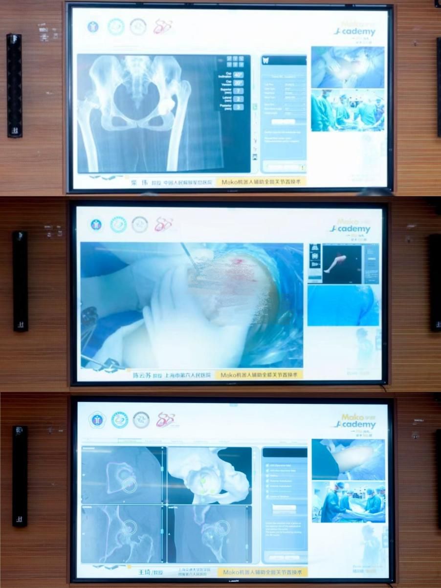 手术示教环节中,通过实时直播演示4台Mako机器人辅助手术,涵盖全膝关节置换、全髋关节置换等术式。镜头全程呈现术前3D建模规划、机械臂实时导航截骨、假体精准植入的完整流程,专家在术中同步讲解机器人“实时动态校准”“神经血管智能保护”等核心功能。学员通过高清画面清晰观察手术细节,结合实时提问实现“沉浸式”学习。