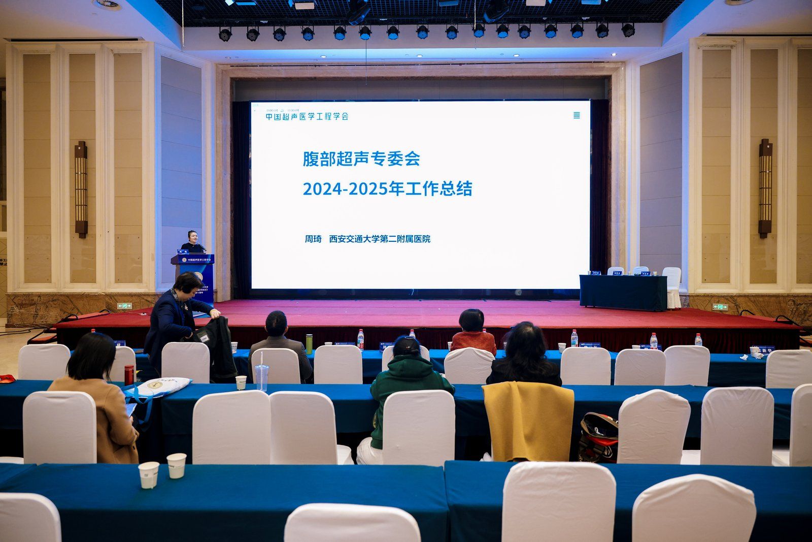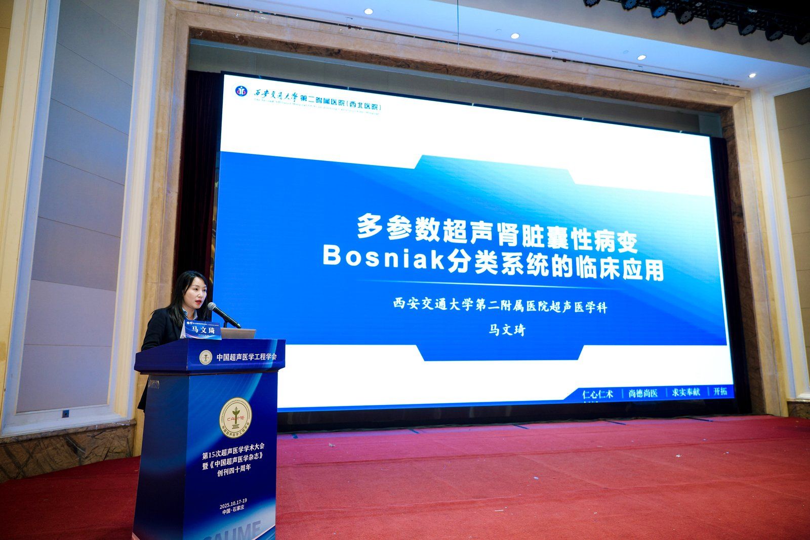 在随后的学术交流环节,腹部分会场内容聚焦超声新技术在肝脏及胃肠疾病领域的临床应用,议题前沿、内容务实,吸引了众多参会者的关注。周琦教授、姜珏教授分别受邀担任该环节的主持嘉宾。马文琦副主任医师以“基于多参数超声肾囊性病变 Bosniak 分类系统的临床应用”为主题进行经验分享,结合临床实际病例,详细阐述了多参数超声在肾囊性病变 Bosniak 分类中的应用价值。其汇报内容紧密结合临床需求,实用性强,得到了参会专家与同仁的高度认可,为肾囊性病变的超声诊断提供了宝贵的临床经验参考。此外,在胃肠超声病例汇报环节,姜珏教授担任主持人,我院师阿盟主治医师积极参与,分享了一例急腹症的超声诊断病例,通过清晰的图像展示、详细的病例分析,深入剖析了该急腹症病例的超声特征、诊断思路及鉴别要点,并结合临床治疗过程引发了在场同仁对急腹症超声诊断相关问题的深度思考,展现了我院青年超声医师的专业能力与成长潜力。