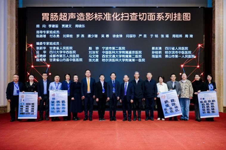 会议开始,腹部专题分会场率先迎来重要环节——中国超声医学工程学会腹部超声专委会胃肠超声标准切面系列挂图发布会。周琦教授主持本次发布会,并与学会领导及专家共同启动挂图的发布仪式。该胃肠超声标准切面系列挂图由周琦教授牵头组织编写,制定历时2年,自项目启动以来,得到了中国超声医学工程学会的大力支持与积极推动。在挂图的研发过程中,从最初的构思设想、内容编写,到后续的图像筛选、标准审定,每一个环节都凝聚了腹部超声专委会全体专家的心血与智慧,离不开专家们的潜心研究与反复论证。该挂图的成功发布,填补了国内胃肠超声检查标准切面领域的空白,为全国超声工作者在胃肠道检查中提供了统一、规范的操作标准与清晰的 “导航” 指引,将有效提升我国胃肠超声检查的准确性与规范性。