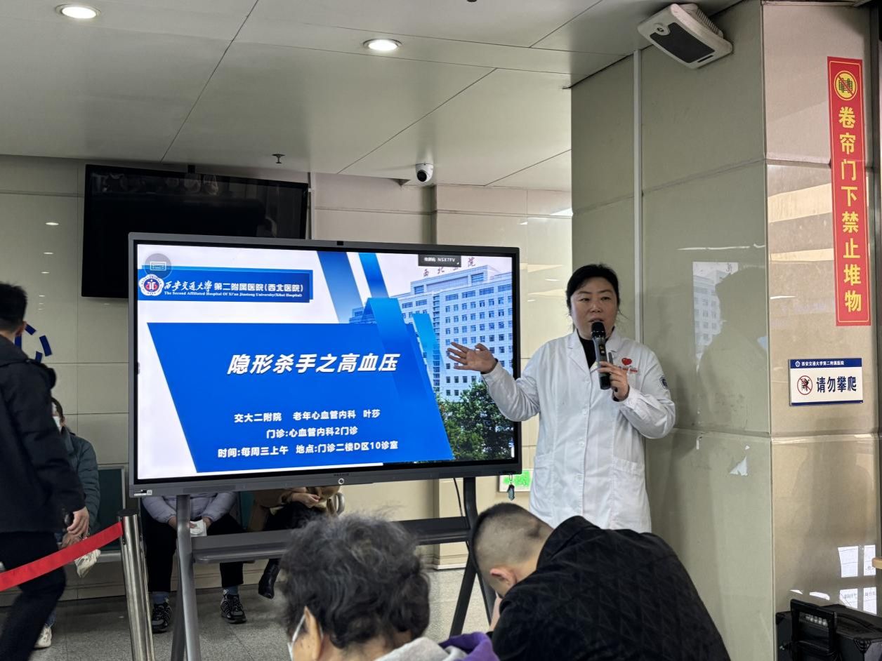 为进一步普及高血压防治知识,提高公众对高血压的认知和自我管理能力,今天上午9:30,我院在综合大楼三层候诊大厅成功举办了以“隐形杀手之高血压”为主题的健康教育讲座。本次活动特邀老年心血管内科副主任医师叶莎老师主讲,吸引了众多患者及家属积极参与,现场气氛热烈。
