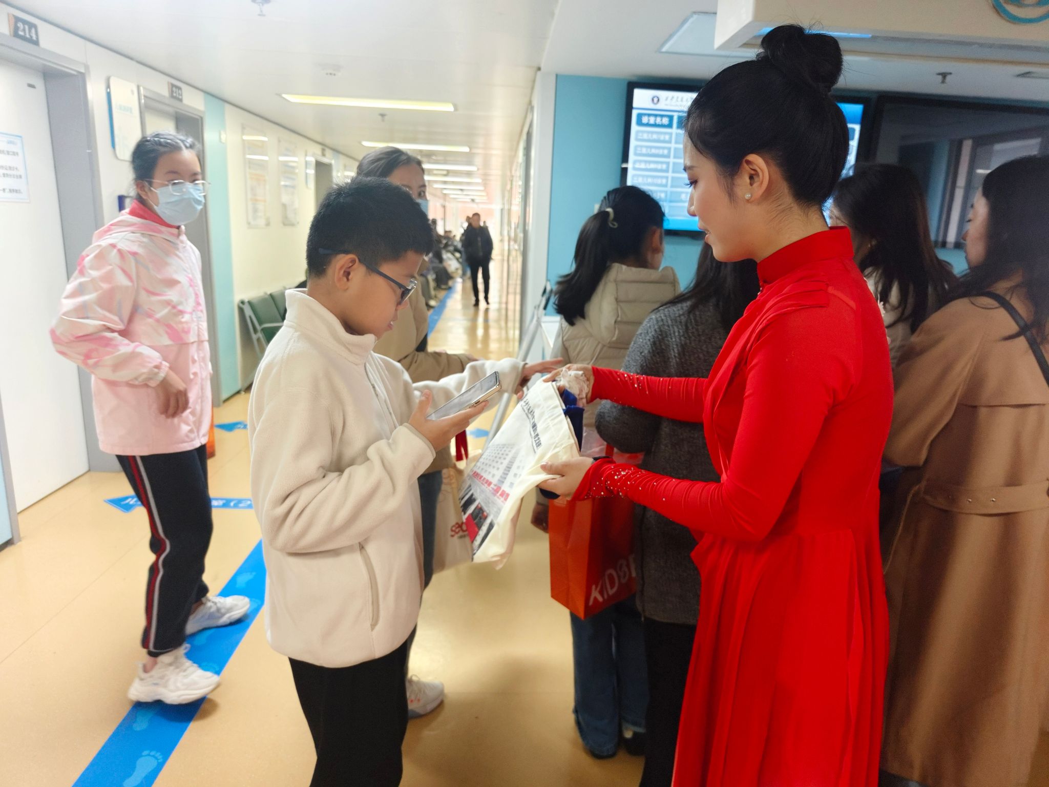 随着悠扬的旋律响起,5名来自我院舞蹈协会的医务人员跳起舞蹈《光亮》,往来患者纷纷驻足。舞蹈落幕,医务人员随即为现场患者及家属送上院庆定制布袋,实用的文创礼品承载着"仁心仁术、尚德尚医"的院训传承,更饱含对患者早日康复的诚挚祝福。