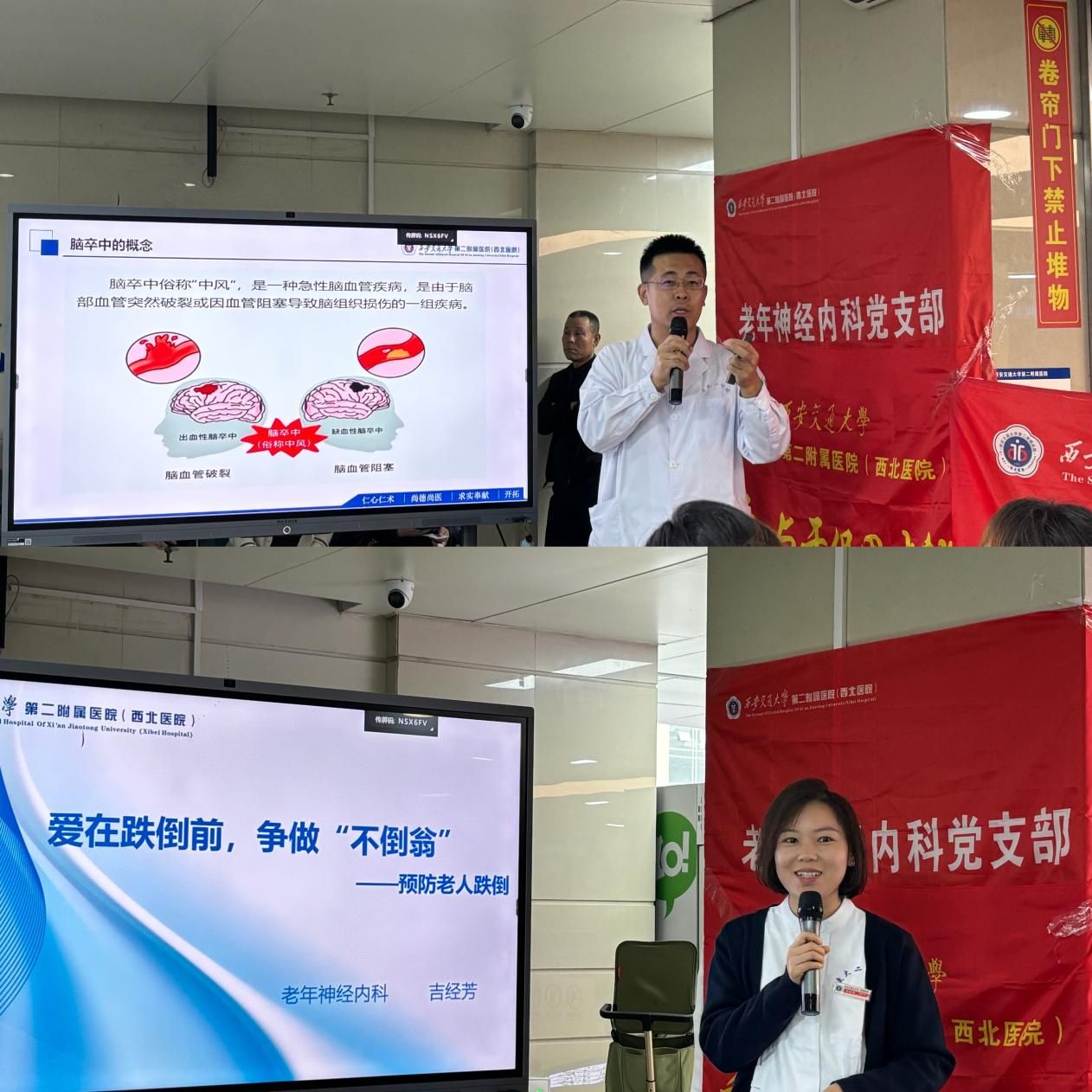 三楼健康科普大讲堂同步展开,聚焦老年人高度关注的健康议题。老年神经内科张有友医生与吉经芳护师联袂主讲,围绕“脑卒中早期识别与急救”和“老年人跌倒预防”两大主题,以通俗语言结合典型案例,深入浅出地讲解防治知识。现场互动积极,反响热烈,许多老人表示“听得懂、用得上”,有效提升了自我保健意识和能力。