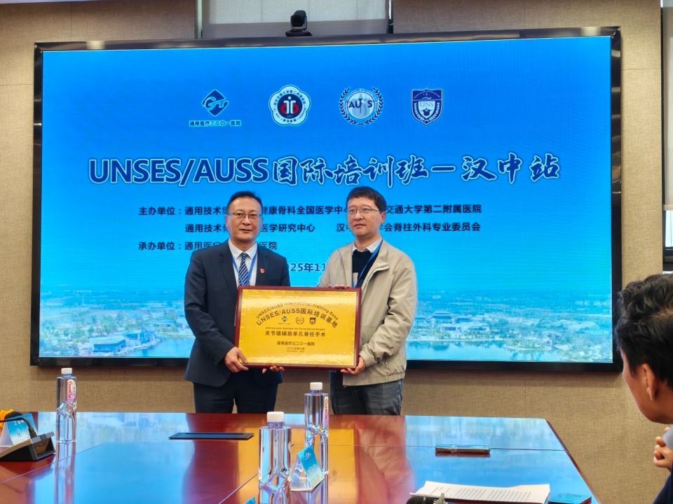 随后,我院脊柱与骨肿瘤病区李锋涛副教授向通用医疗三二〇一医院举行了UNSES国际培训基地授牌仪式,标志着我院汉中三二〇一工作站成立了国内又一个UNSES国际培训基地。活动期间,我院团队联合汉中三二〇一医院骨科团队,完成高难度UNSES手术直播演示。团队术中采用“单侧入路双侧减压”ULBD技术,通过1.5厘米切口完成腰椎病变节段神经的充分减压,术中出血量不足20毫升,术后患者恢复良好。