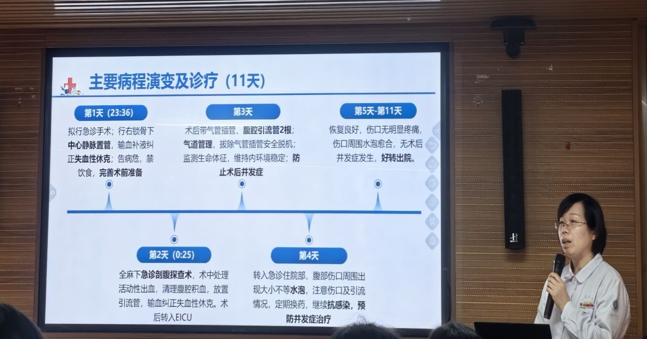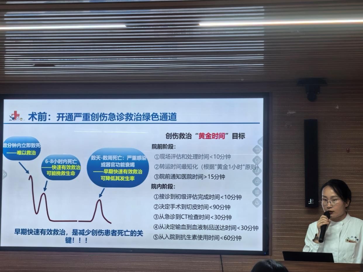 理论引领实践,急诊科时雨老师随之进行了深入细致的护理问题与措施汇报。她以患者入院后的时间轴为主线,环环相扣地阐述了从快速评估到精准干预的全过程护理方案。汇报中,她对“严重创伤急诊救治绿色通道”的深入讲解,成为全场亮点。这不仅是一条挽救生命的“高速路”,更是一套融合了快速响应、多学科协作与精准时间管理的现代化救治体系,充分彰显了我院在急危重症救治领域高效协同的硬核实力。