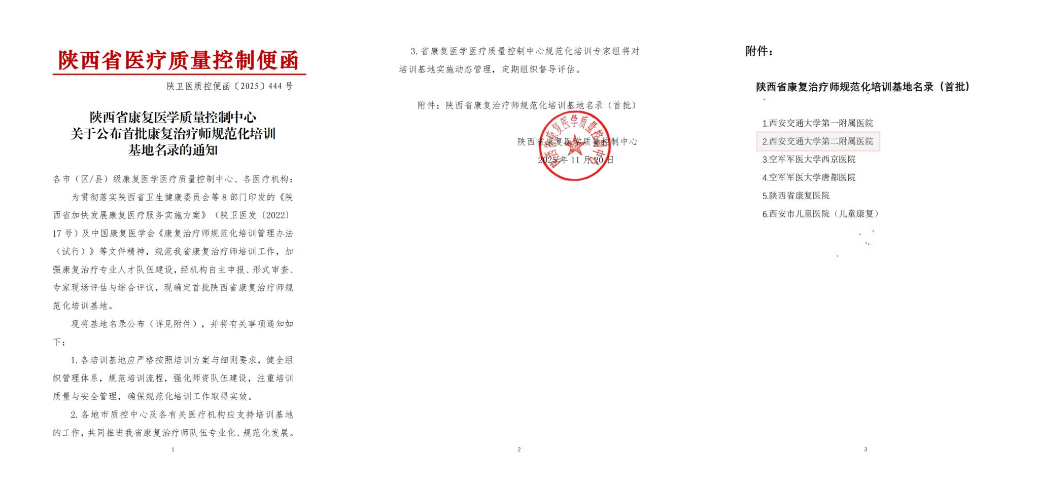 近日,陕西省康复医学质量控制中心正式印发陕卫医质控便函〔2025〕444 号文件,公布了首批陕西省康复治疗师规范化培训基地名录,西安交通大学第二附属医院凭借雄厚的学科实力、完善的教学体系和优质的医疗服务,成功获批成为首批培训基地,这标志着医院在康复医学人才培养领域获得省级权威认可,将为陕西省康复治疗师队伍专业化、规范化建设注入强劲动力。